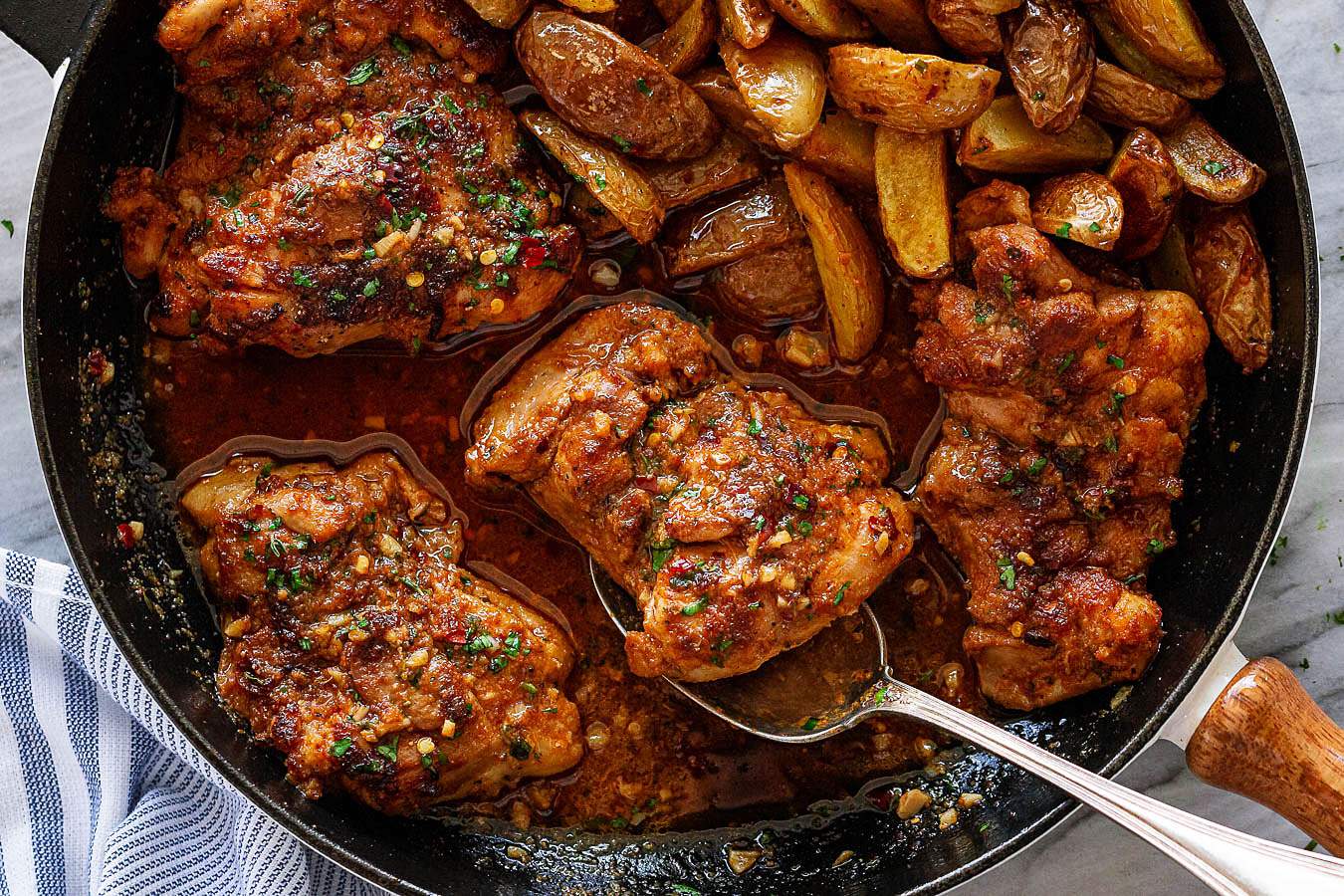 Sheet Pan Honey Garlic Chicken Thighs - Wry Toast. Chicken thighs, along with the leg and wings make up the dark meat portion of the bird. Season chicken with salt and pepper. How to store cooked chicken thighs. Refrigerate chicken thighs within two hours of cooking. The key is to cook the chicken thighs in a 400 degree f oven for 50 minutes. If cooking more thighs than can fit in a pan should the whole process be repeated in a clean pan for the 2nd batch. Crispy chicken thighs cooked in pan and oven. Chicken thighs can be cooked as they are, straight from the package. How to make chicken thighs with crispy skin. Preparation preheat oven to 475°f. The skin of the chicken is the best part, don't even deny it. Naturally juicer than the breast of the chicken, dark meat retains a tender texture without extra fuss. These cuts cook relatively quickly whether cooking on the stovetop in a frying pan or in a baking pan in the oven. Make sure that they are completely cooled. Made a little pan sauce to serve over the smashed potatoes with the juice left in the skillet (little flour, make a roux, add some chicken broth, maybe a little water if.